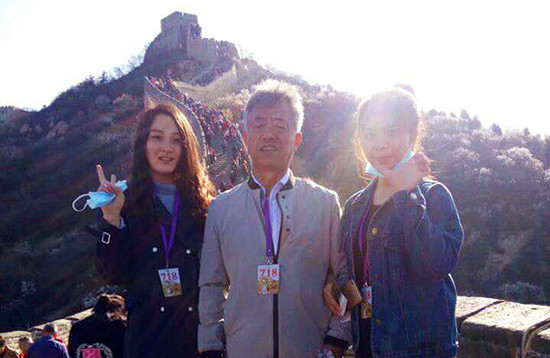 张跃丰老人(中)与两位河大学子在八达岭长城