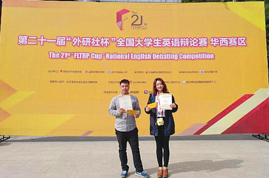 4月28日至4月30日,外语学院2015级翻译专业周琨杰同学、英语专业祝尚珍同学代表学校奔赴兰州交通大学参加第二十一届“外研社杯”全国大学生英语辩论赛华西赛区总决赛。经过两天五轮赛事的激烈角逐。两位同学沉着应战、配合默契,凭借着缜密的逻辑、流利的口语和精彩的论证征服了在场的评委和观众,从一百支来自华西各地大学的优秀队伍中脱颖而出,获得一等奖,成功晋级全国总决赛。两位同学将代表学校参加五月下旬在北京外国语大学举办的第二十一届“外研社杯”全国大学生英语辩论赛全国总决赛,与来自全国各地的优秀辩手同台竞技。