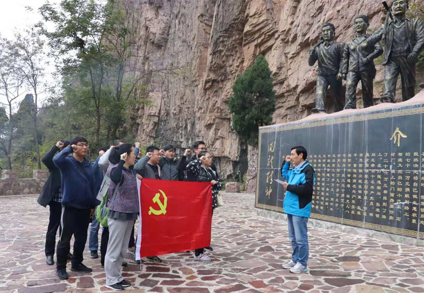在回龙村,教师党员们先后参观了回龙精神展览室,观看了回龙村发展纪实专题片——当代愚公,展厅里记录着回龙人团结拼搏、可歌可泣的精神史的一幅幅图片、一座座奖杯、一段段视频,引得教师党员们驻足凝视许久。在青峰关隧道口,全体教师党员怀着崇敬的心情,面对鲜红的党旗,庄严地举起右手,重温入党誓词,“为共产主义奋斗终身”,宣誓共产党人坚定的理想信念。宣誓结束后,全体教师党员沿着当年张荣锁同志带领回龙村村民修筑的挂壁公路和S型隧道徒步参观,实地感受回龙人劈山凿洞、云端筑路的艰辛与伟大。