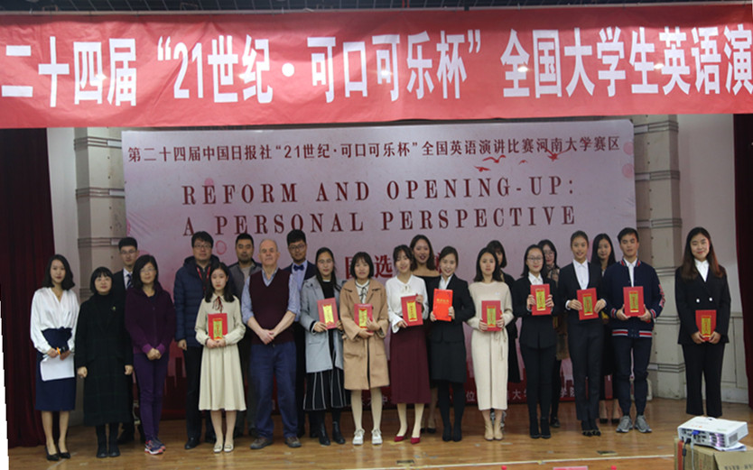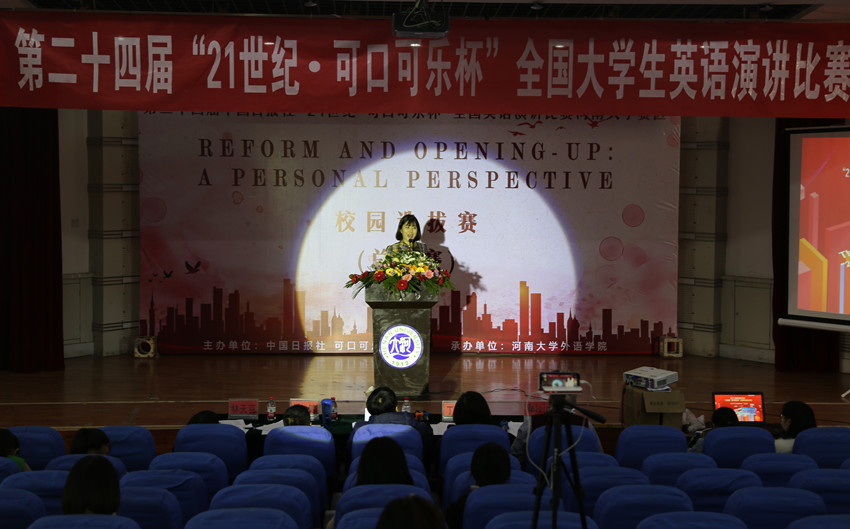 11月9日下午,由外语学院承办的第24届“21世纪•可口可乐杯”全国大学生英语演讲比赛河南大学赛区校园选拔赛总决赛于明伦校区科技馆二楼举行。本次比赛特邀付江涛、侯健、林天羽、丁岚、英语外教Melvin担任评委。