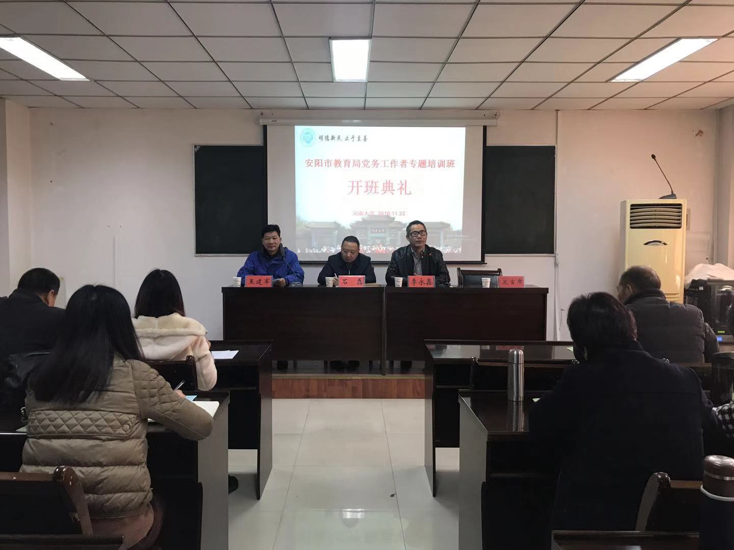 11月22日上午,安阳市教育局党务工作者专题培训班开班仪式在我校干部培训中心402教室举行。安阳市教育局党组成员、安阳市纪委监委住安阳市教育局纪检监察组组长石磊,教育科学学院党委副书记、常务副院长、教师教育学院院长李永鑫出席开班仪式,仪式教育科学学院副院长王建军主持。
