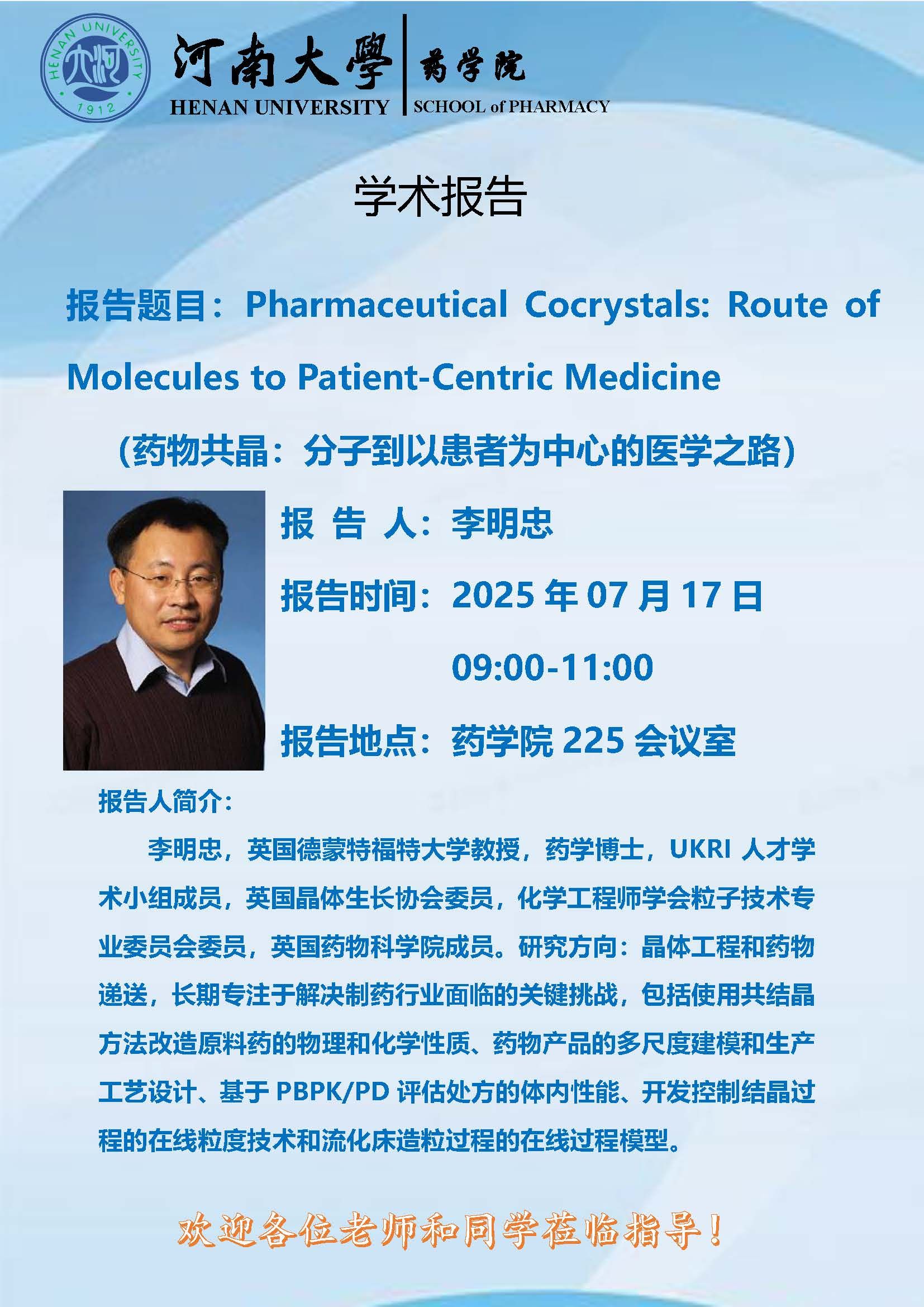 李明忠: 药物共晶:分子到以患者为中心的医学之路 (时间:07月17日 )