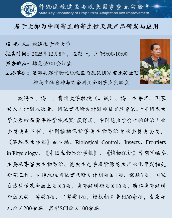 臧连生:基于大卵为中间寄主的寄生性天敌产品研发与应用(时间:12月8日)
