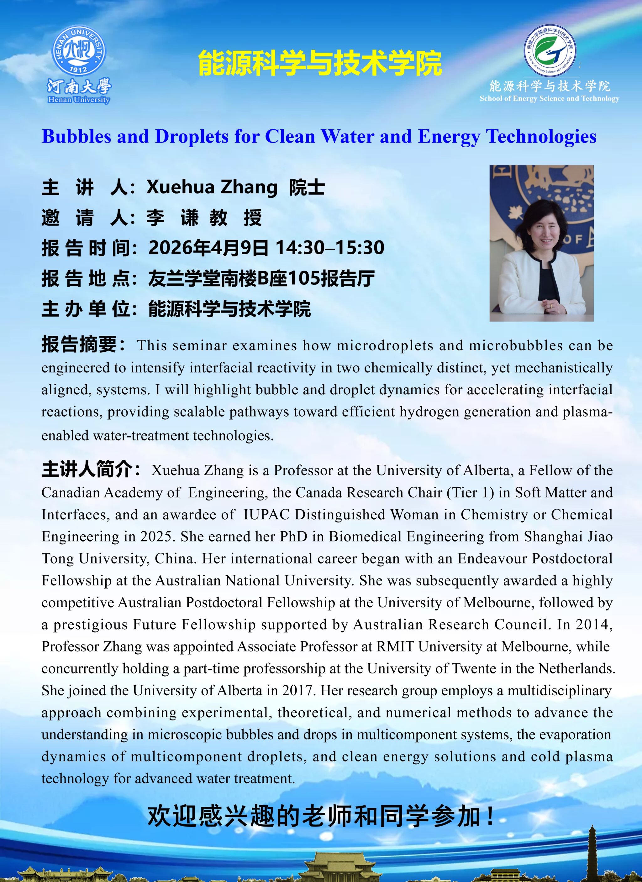 Xuehua Zhang:Bubbles and Droplets for Clean Water and Energy Technologies(时间:4月9日)