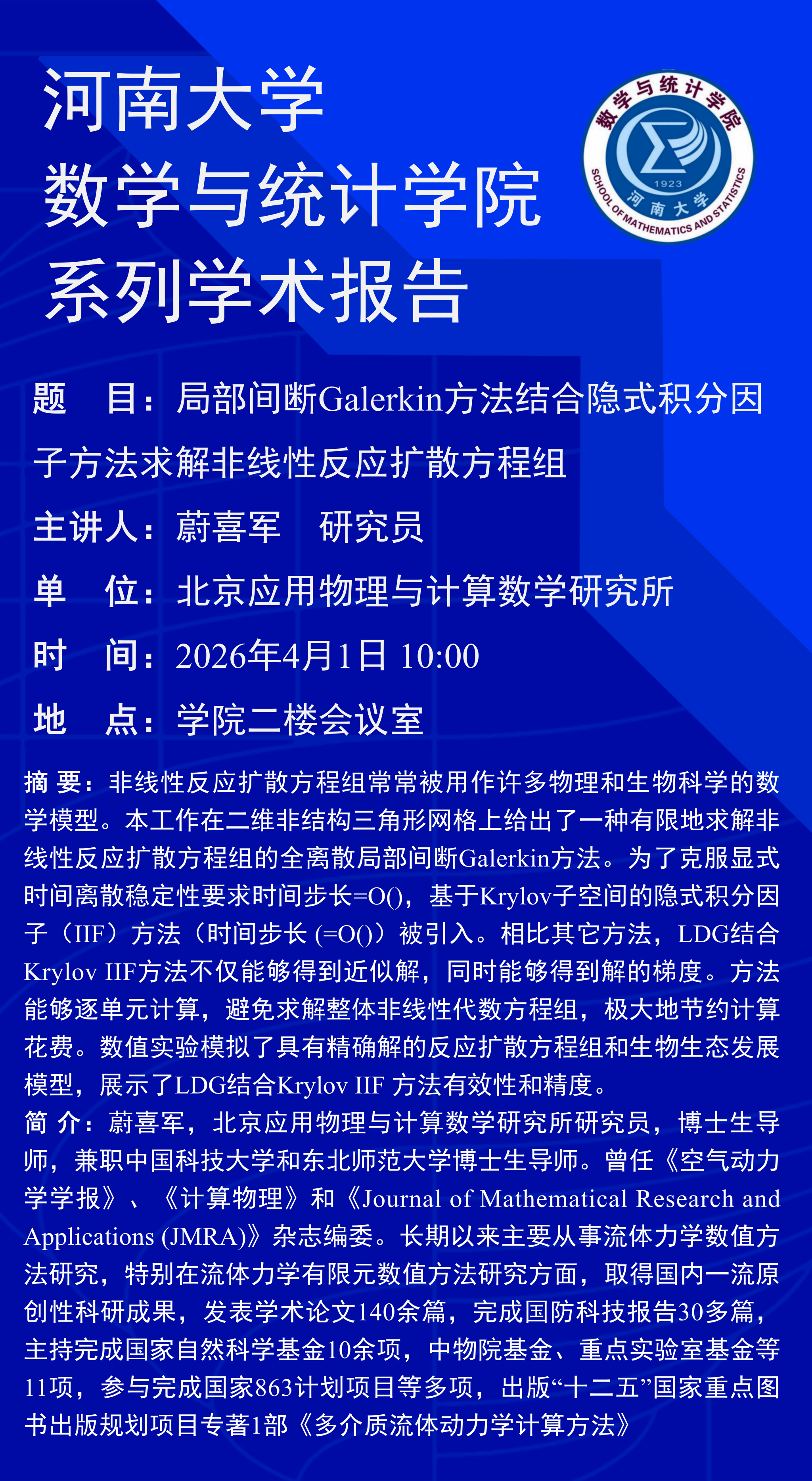 蔚喜军:局部间断Galerkin方法结合隐式积分因子方法求解非线性反应扩散方程组(时间:4月1日)