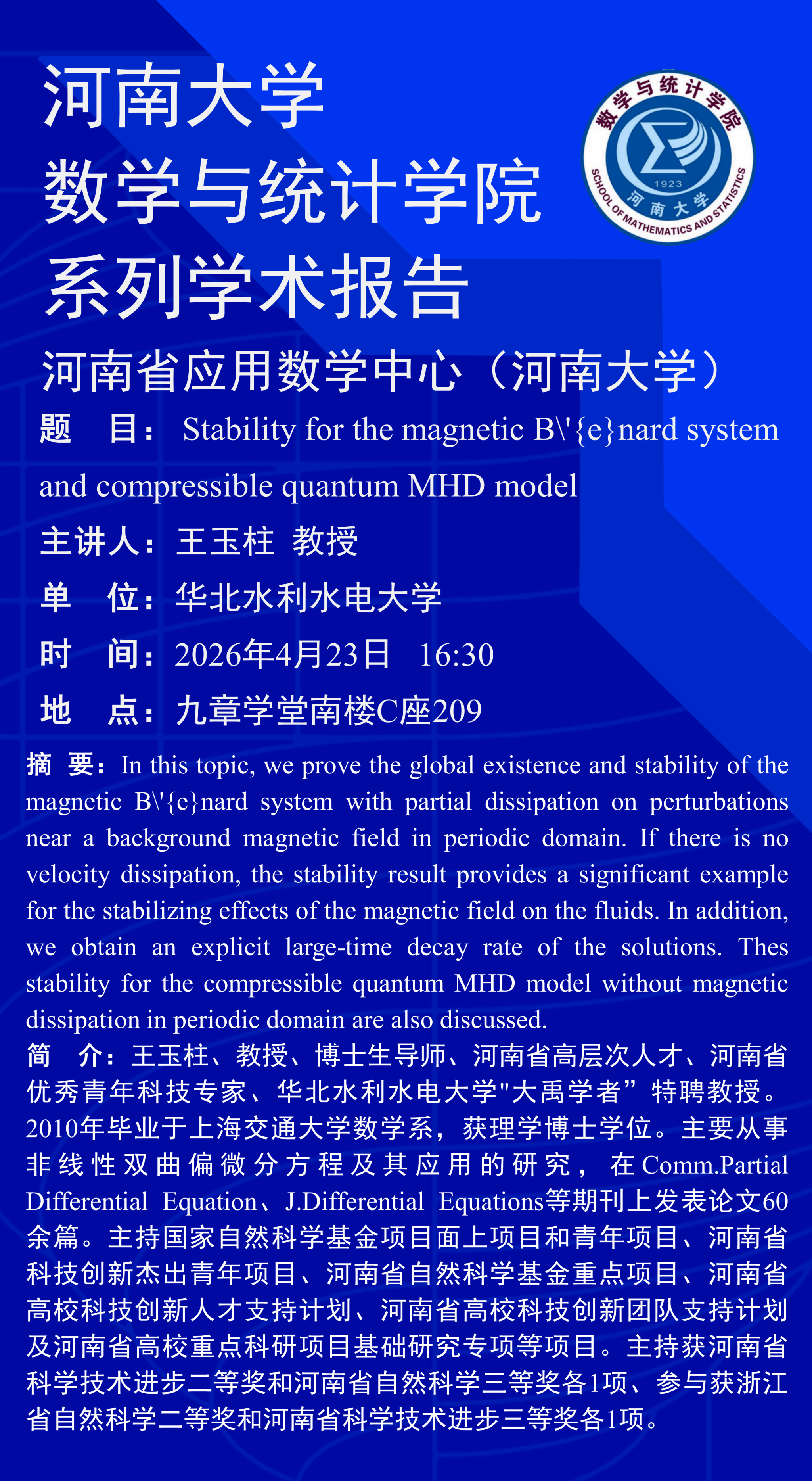 王玉柱:Stability for the magnetic B\'{e}nard system and compressible quantum MHD model(时间:4月23日)