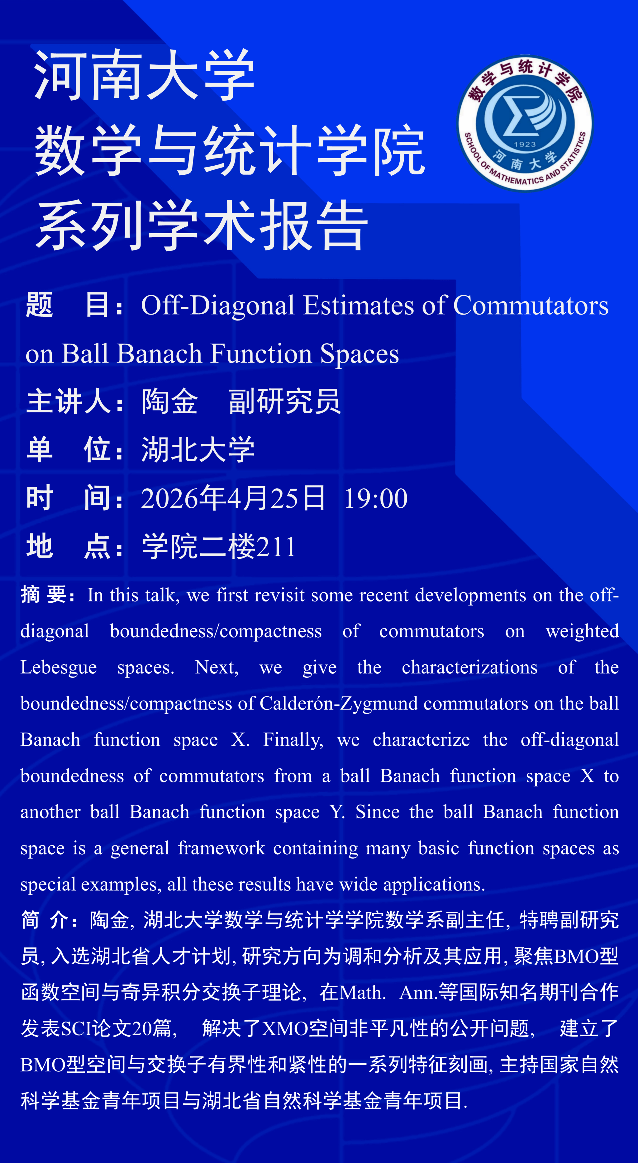 陶金:Off-Diagonal Estimates of Commutators on Ball Banach Function Spaces(时间:4月25日)
